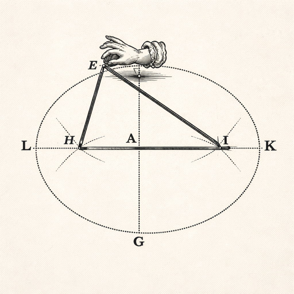 The illustration above comes from the 17th-century manuscript Sive de Organica Conicarum Sectionum in Plano Descriptione, Tractatus (A Treatise on Devices for Drawing Conic Sections) by the Dutch mathematician Frans van Schooten. The ellipse construction in the illustration is quite simple. Press two pins into a corkboard, place a loop of string around the pins, pull the string tight with a pencil, and trace the pencil tip’s path as you pull the pencil around the taut string. Guaranteeing that the traced path is an ellipse is this definition of an ellipse: An ellipse is the set of points P such that PF1 + PF2 is constant for two fixed points, F1 and F2.