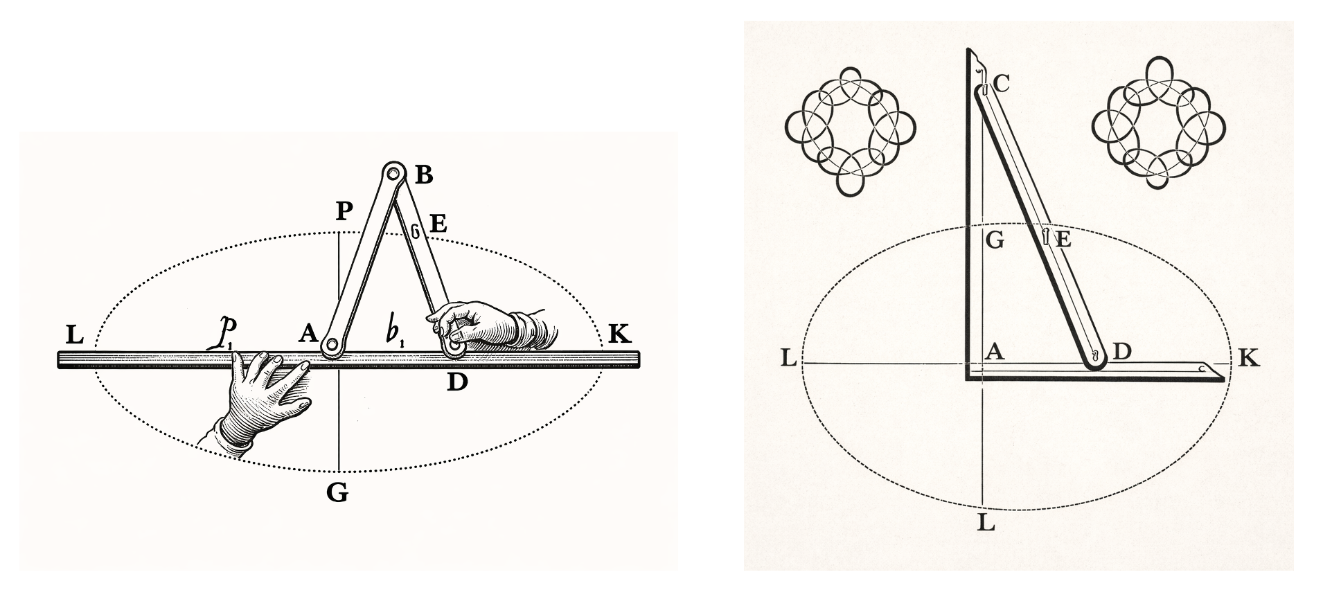 The 17th-century Dutch mathematician Frans van Schooten developed “hands-on manipulatives” centuries before the term became popular in math education circles. Below are two images of ellipse-drawing linkages from van Schooten’s manuscript, Sive de Organica Conicarum Sectionum in Plano Descriptione, Tractatus (A Treatise on Devices for Drawing Conic Sections).