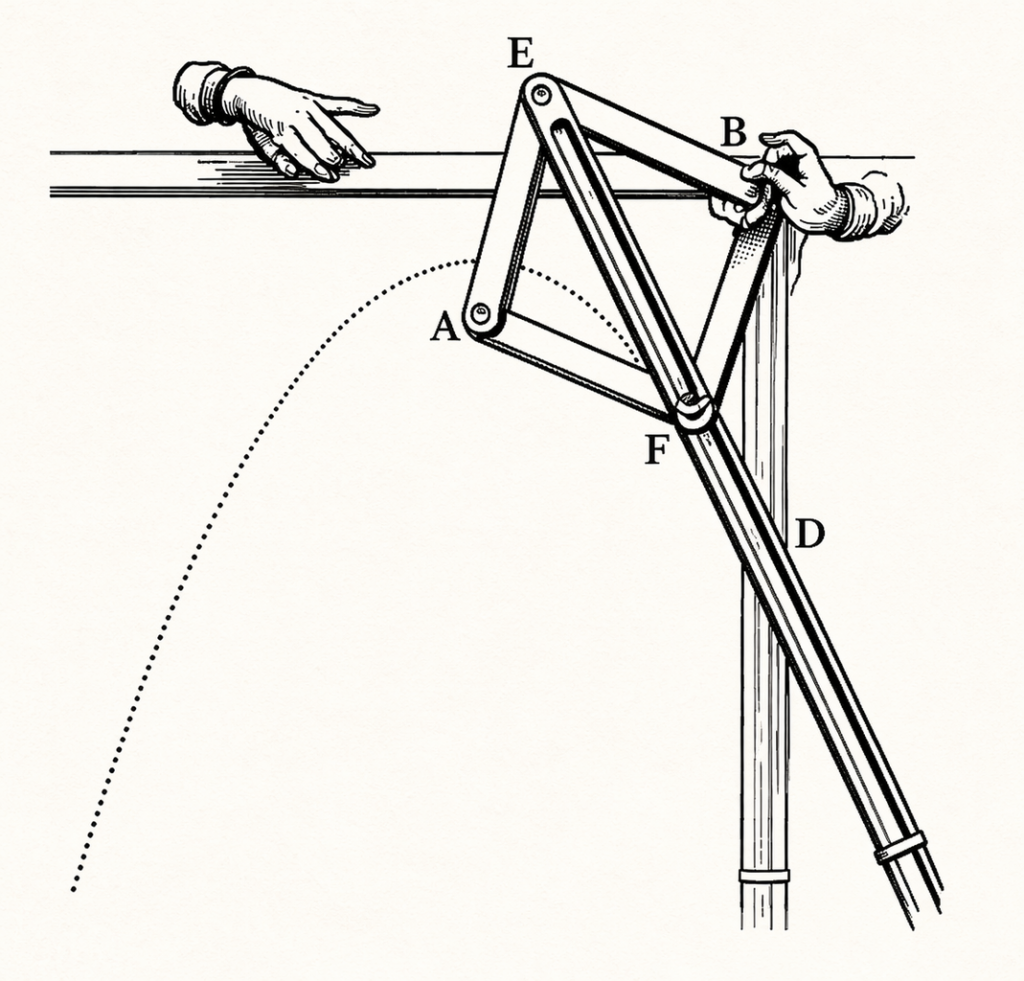 Experiment with the interactive models and think about why they generate parabolas. The rhombus construction is based on an illustration found in the 17th-century Dutch mathematician Frans van Schooten’s manuscript, Sive de Organica Conicarum Sectionum in Plano Descriptione, Tractatus (A Treatise on Devices for Drawing Conic Sections). Van Schooten’s beautiful picture is below. You’ll find many more of van Schooten’s constructions in my book Exploring Conic Sections with The Geometer’s Sketchpad.
