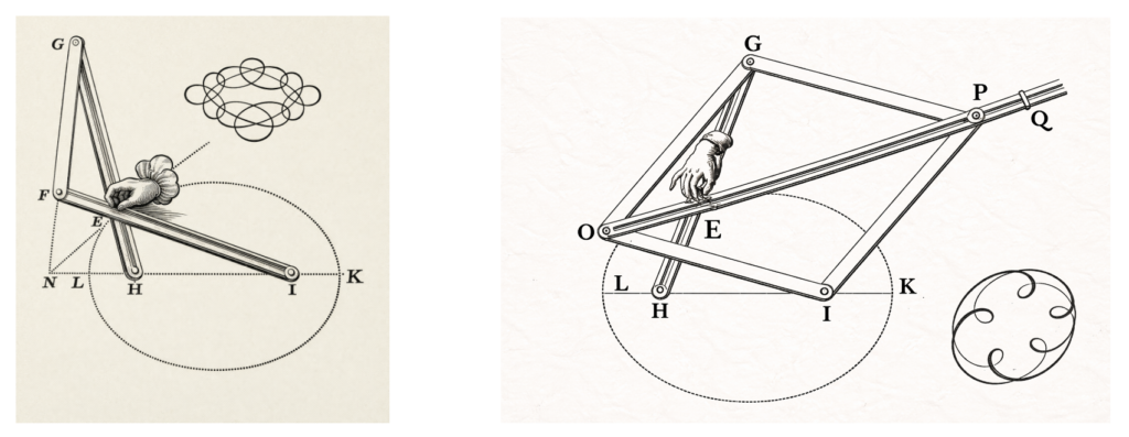 A visit to the library confirmed David’s findings. There in van Schooten’s book were drawing after drawing of devices that drew conics. The illustrations were exquisite, with artistic flourishes adorning many of them.