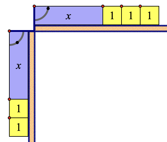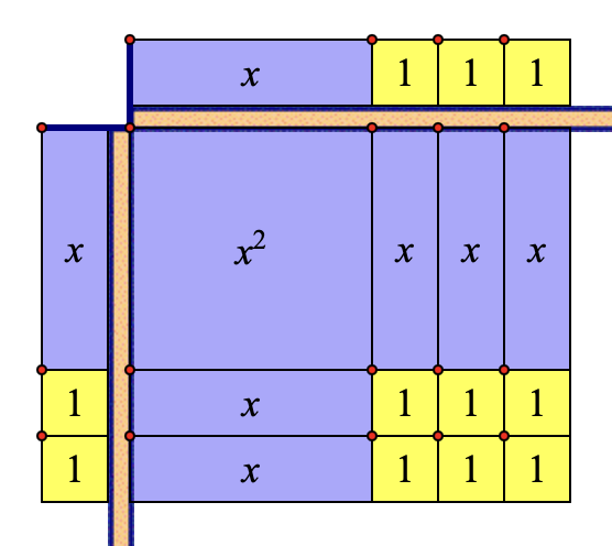 Down below (and here) is a Web Sketchpad model of algebra tiles. To model (x + 3)( x + 2), begin by using the 1 and x tools to create “trains” along the horizontal and vertical axes. Specifically, build an x + 1 + 1 + 1 train along the horizontal axis and an x + 1 + 1 train along the vertical axis (Drag the “flipper point” to change an x tile from horizontal to vertical.) These two trains define a rectangle with a length of x + 3 and a width of x + 2.